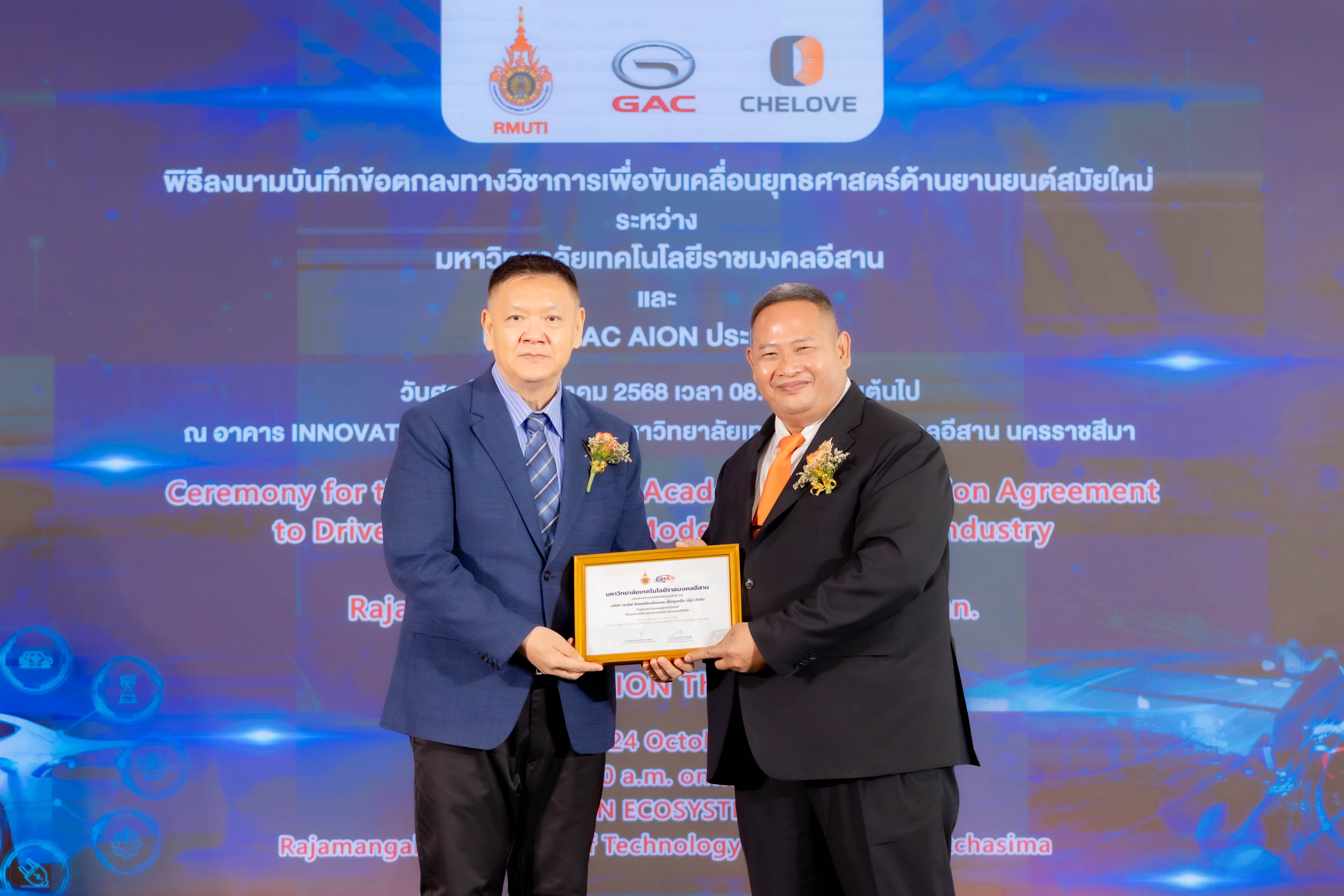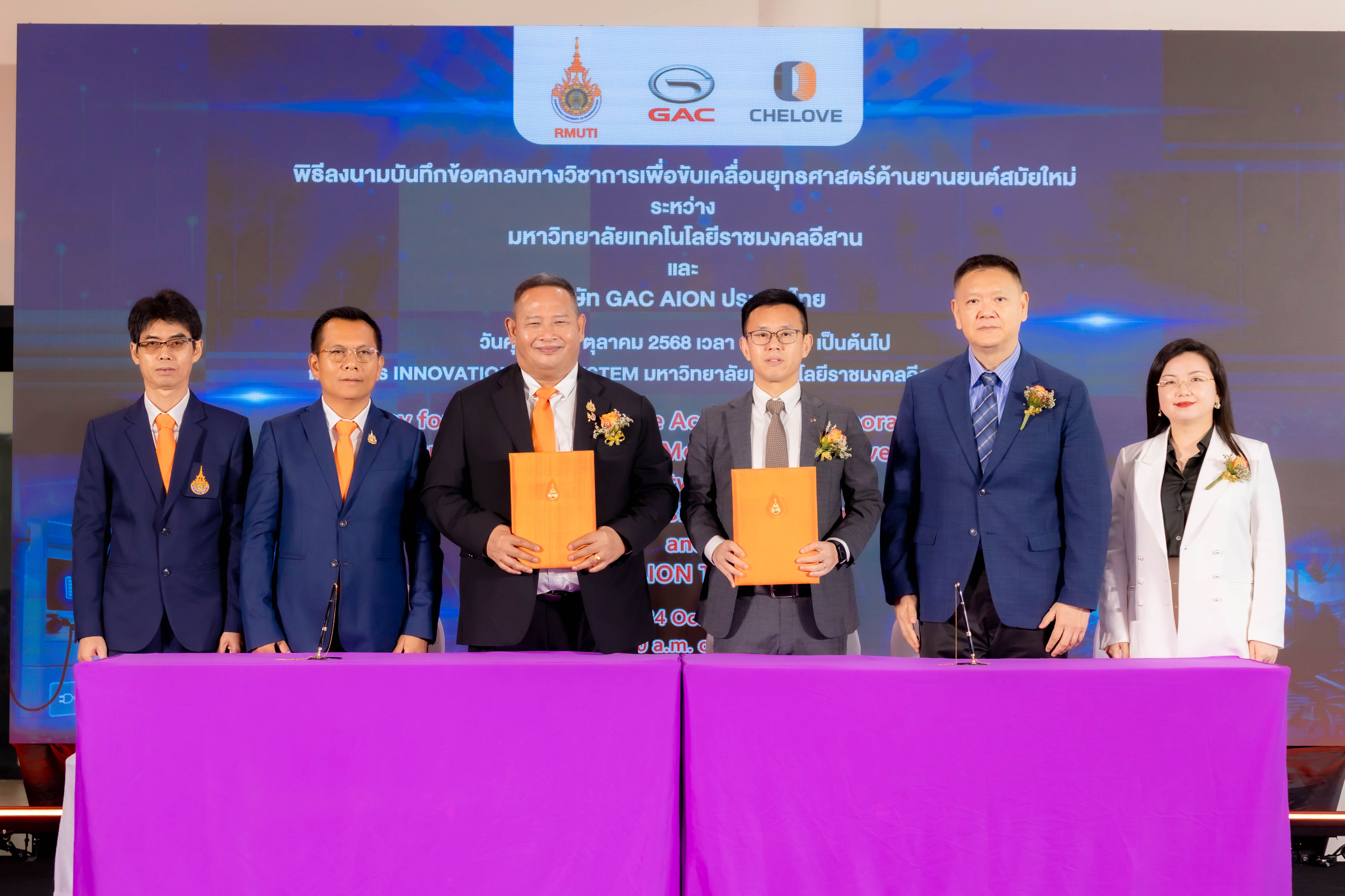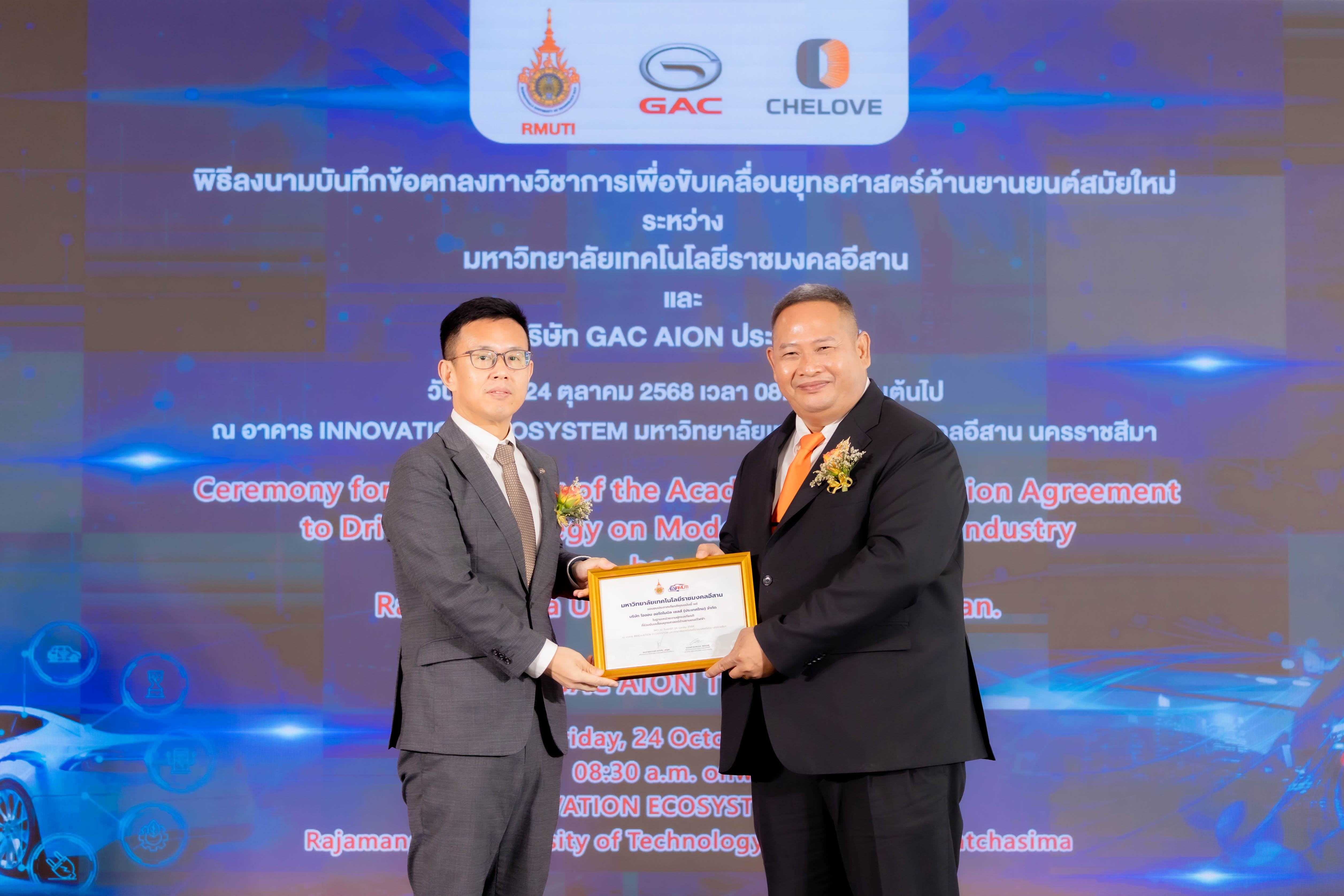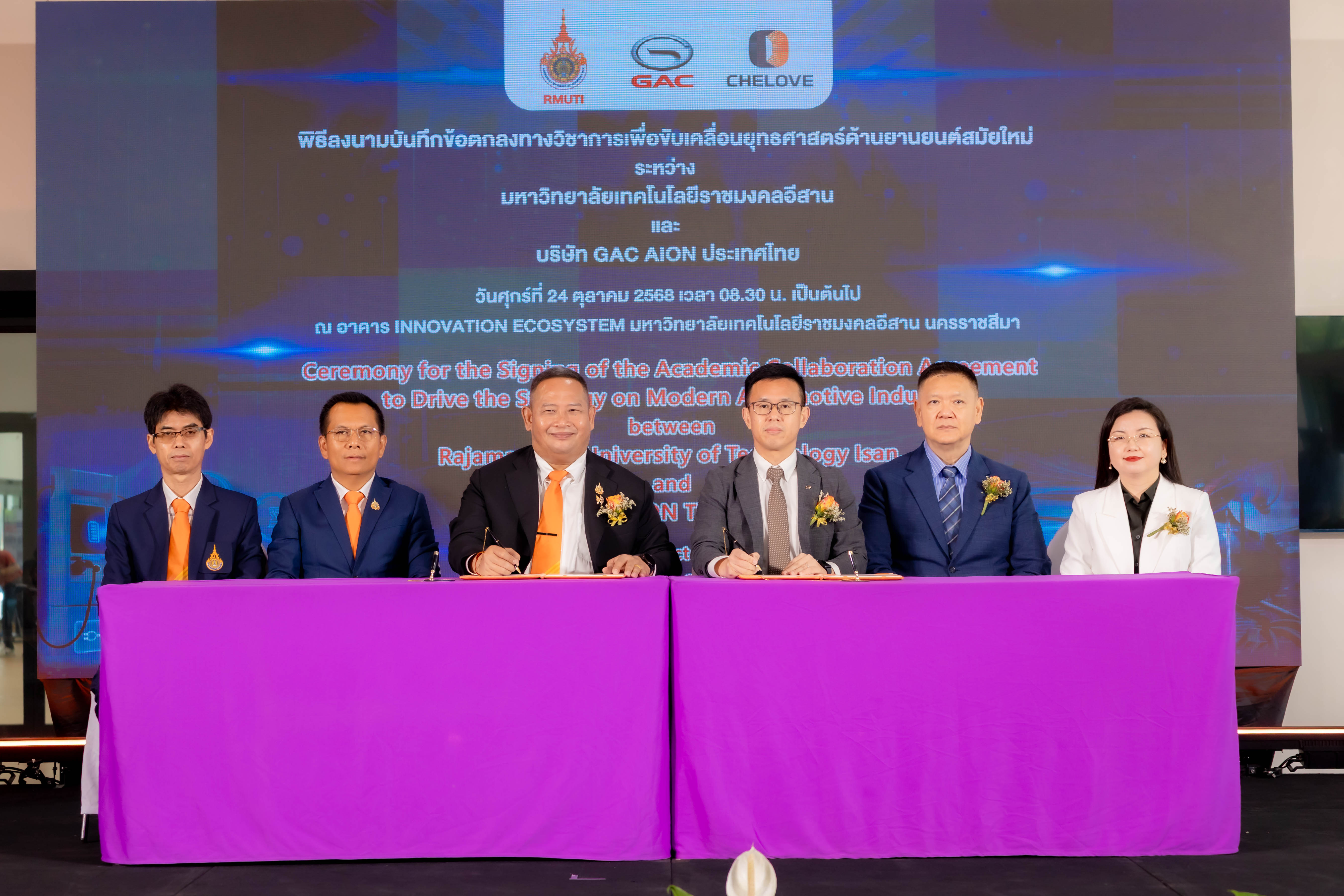 วันที่ 24 ตุลาคม 2568 — บริษัท เชเลิฟ อินเตอร์เนชั่นแนล เอ็ดดูเคชั่น กรุ๊ป จำกัด (CHELOVE International Education Group) พร้อมคณะผู้บริหารระดับสูง เข้าร่วมพิธีลงนามบันทึกข้อตกลงความร่วมมือระหว่าง มหาวิทยาลัยเทคโนโลยีราชมงคลอีสาน (Rajamangala University of Technology Isan) และ บริษัท ไอออน ออโตโมบิล เซลส์ (ประเทศไทย) จำกัด (GAC AION) โดยมี รศ.ดร.โฆษิต ศรีภูธร อธิการบดีมหาวิทยาลัยเทคโนโลยีราชมงคลอีสาน และ นายหวาง ห้าวหย่ง ผู้จัดการทั่วไป บริษัท GAC AION Thailand ร่วมลงนามในพิธี พร้อมได้รับเกียรติจาก พลโท ปิยะพณห์ ฐิตวัฒนานนท์ แม่ทัพน้อยที่ 2, นายไพศาล ที่รัก ศึกษาธิการจังหวัดนครราชสีมา, นางพิรุณวรรณน์ จงใจภักดิ์ พาณิชย์จังหวัดนครราชสีมา, นายพินิจ ช่างไม้ พลังงานจังหวัดนครราชสีมา, ดร.สำเร็จ วงศ์ศักดา ผู้อำนวยการสถาบันการอาชีวศึกษาภาคตะวันออกเฉียงเหนือ 5, นางจิตโสมนัส ชัยวงษ์ ผู้อำนวยการสำนักงานอาชีวศึกษาจังหวัดนครราชสีมา และ นางสาวเพ็ญนภา ศักดิ์ศรี ผู้อำนวยการสถาบันพัฒนาฝีมือแรงงาน 5 นครราชสีมา ร่วมเป็นสักขีพยานในพิธีอันทรงเกียรติครั้งนี้ ซึ่งจัดขึ้น ณ อาคาร Innovation มหาวิทยาลัยเทคโนโลยีราชมงคลอีสาน จังหวัดนครราชสีมา