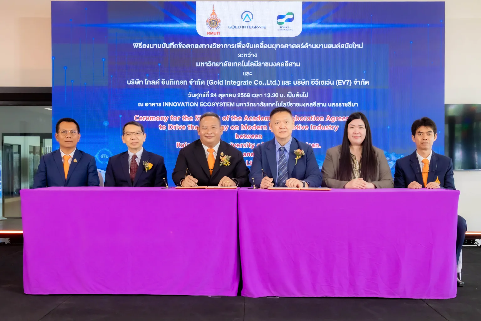 เมื่อวันที่ 24 ตุลาคม 2568 มหาวิทยาลัยเทคโนโลยีราชมงคลอีสาน (RMUTI) นำโดย รองศาสตราจารย์ ดร.โฆษิต ศรีภูธร รักษาราชการแทนอธิการบดี มทร.อีสาน พร้อมด้วย ท่านพิริยะ เข็มพล กรรมการสภามหาวิทยาลัยผู้ทรงคุณวุฒิ (ด้านยานยนต์ไฟฟ้า) และคณะผู้บริหารมหาวิทยาลัย ให้การต้อนรับ นายหวง หย่งเจีย กรรมการ บริษัท โกลด์ อินทิเกรท จำกัด และ บริษัท อีวีเซเว่น (EV7) จำกัด พร้อมคณะผู้บริหาร ในโอกาส ร่วมลงนามบันทึกข้อตกลงความร่วมมือทางวิชาการ (MOU) ระหว่าง มหาวิทยาลัยเทคโนโลยีราชมงคลอีสาน บริษัท โกลด์ อินทิเกรท จำกัด (Gold Integrate Co., Ltd.) และบริษัท อีวีเซเว่น จำกัด (EV7 Co., Ltd.) โดยมี บริษัท เชเลิฟ อินเตอร์เนชั่นแนล เอ็ดดูเคชั่น กรุ๊ป จำกัด (Chelove International Education Group Co., Ltd.) ร่วมเป็นสักขีพยานในพิธีลงนาม ซึ่งจัดขึ้น ณ อาคาร Innovation มหาวิทยาลัยเทคโนโลยีราชมงคลอีสาน จังหวัดนครราชสีมา