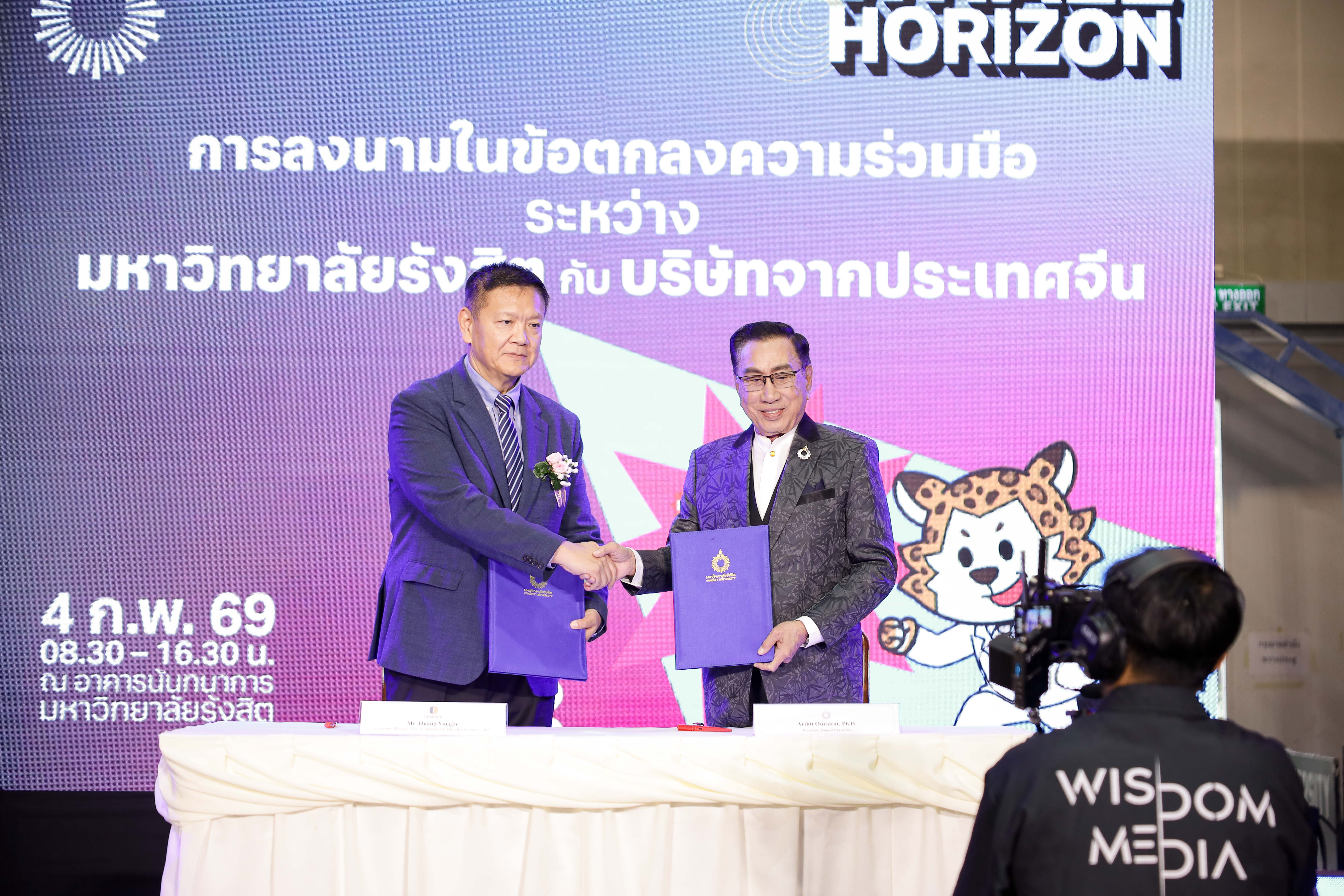 พิธีลงนามในครั้งนี้ได้รับเกียรติจาก ดร.อาทิตย์ อุไรรัตน์ อธิการบดีมหาวิทยาลัยรังสิต และ นายหวัง หย่งเจีย กรรมการผู้มีอำนาจลงนาม บริษัท เชเลิฟ อินเตอร์เนชั่นแนล เอ็ดดูเคชั่น กรุ๊ป จำกัด ร่วมลงนามความร่วมมือครั้งสำคัญ ซึ่งสะท้อนถึงเจตนารมณ์ร่วมกันในการยกระดับการศึกษาและการพัฒนาทรัพยากรมนุษย์ของประเทศให้สามารถแข่งขันได้ในระดับสากล
